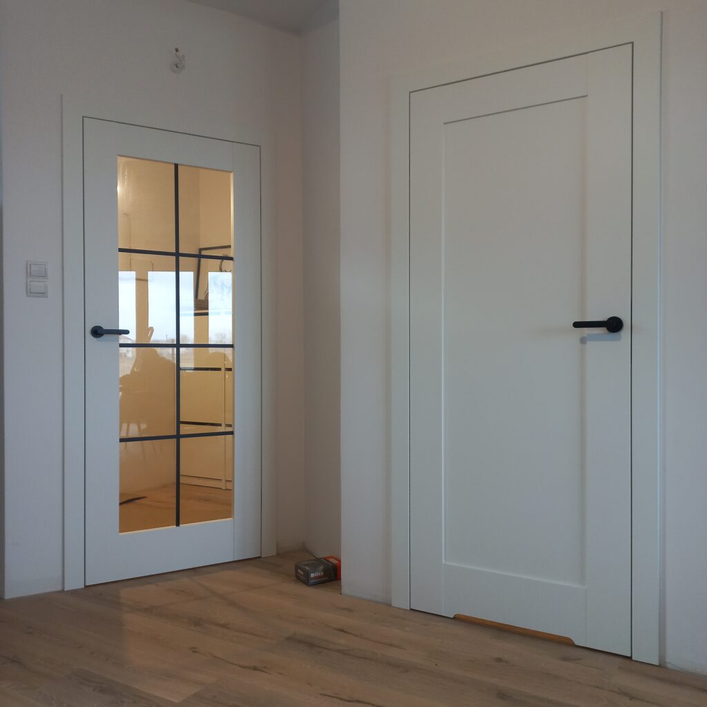- Montaż drzwi wewnętrznych na ościeżnicy nakładanej – usługa obejmuje;
